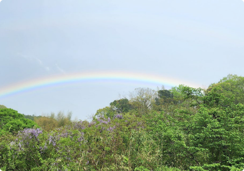 それから黒板とノ ートに 7 色の美しい線を描いたその日の放課後、学園から外を見ると大きな虹が空に二重 にかかっていました。空に願いが通じ、子どもたちのこれからの成長を祝福してくれている かのようでした。