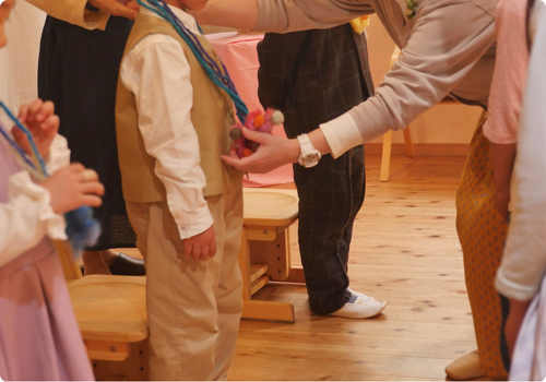 入学式のお話は、フォルメンのエポックのお話として続きました。子どもたちはお話の中の小さな冒険の旅に出かけては、まっすぐ伸びる光や竹林と出会ったり、丸い池のほとりを曲がって歩いたりしながら、直線と曲線に出会い、学びを進めて います。ある日のエポックで、魔法の馬 7 頭が走り抜けた後に虹の 7 色の輝く石の道が出来たというお話を聞いて、子どもたちは、7 色の首飾りをつけて駆け抜けました。